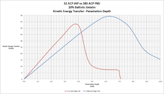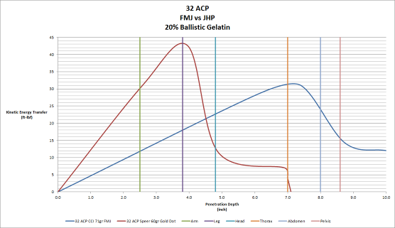 A bullets ability to wound and subsequently disable an attackers body revolves around the fluid drag acting on the bullet and the location in the body at which this occurs. One end of the spectrum would be a 32 ACP JHP which penetrates to 7.0” in 20% ballistic gelatin. Very deep penetration can be had with a 32 ACP FMJ which penetrates to 11.2” in 20% ballistic gelatin. The graph at the left illustrates the kinetic energy transfer of these bullets, overlaid with the depth in the human body that this penetration corresponds to.