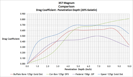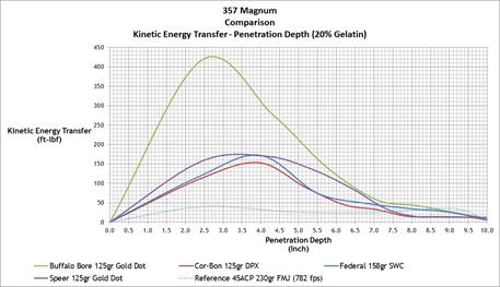 The average 357 Magnum (2" barrel) JHP kinetic energy transfer per inch of penetration is 23 ft-lbf/inch.