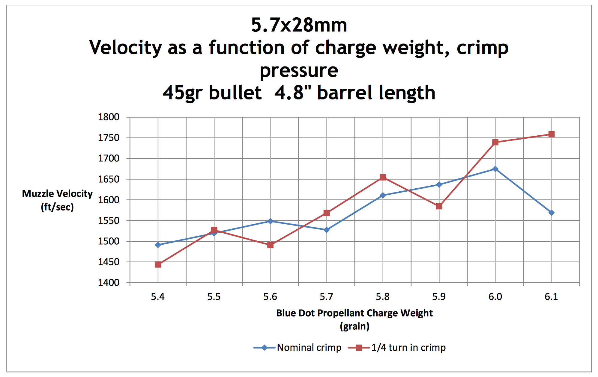 An RCBS 5.7x28mm die set was used for the handloading, where ‘nominal crimp’ is the setup of the dies per the included instructions and 1⁄4 turn in is 1⁄4 rotation of the seating die towards the cartridge case.