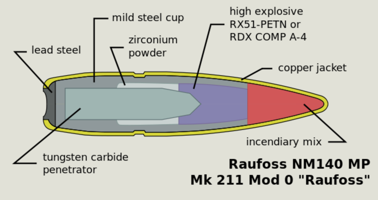 Notice the amount of the car above that is just sheet metal and airspace versus the size of the critical components. Many hits to a car will simply pass through the sheet metal (or the occupants) and have no effect on the movement of the vehicle itself. Here is where the design purpose of the incendiary and explosive projectiles have their nexus. Incendiary projectiles resemble weak explosives when they hit and do limited peripheral damage to the components located around the point of impact. They are moderately effective igniting fuel vapor … which is why in WW-II military aircraft began to be fitted with foam-filled, self-sealing tanks to counter this threat. Against a vehicle with no protective measures to reduce fuel vapor—look out. An absolutely fantastic cartridge, the Mk. 211 from NAAMO (Figure 1), is rightly called the ‘multipurpose round’ because it combines enhanced armor penetration capabilities with a smaller explosive charge and two incendiary compounds. It was the intent of the Norwegian armed forces to upgun the 50 BMGs that they owned, to have terminal performance similar to a standard 20mm cannon round. The incendiary compound in the front of the bullet initiates an explosive train inside of the bullet upon impact. This is then followed by a burster charge of plastic explosive which will propagate a shockwave at a much higher velocity than the bullet is traveling at—hopefully breaking apart a fuel-cell and aerosolizing some of the fuel from the fuel tank. The zirconium incendiary will then ignite this gas vapor and start a fire onboard. In case there is a critical area in the line of the bullet, the tungsten carbine penetrator core is about as good as it gets for hard target penetration.